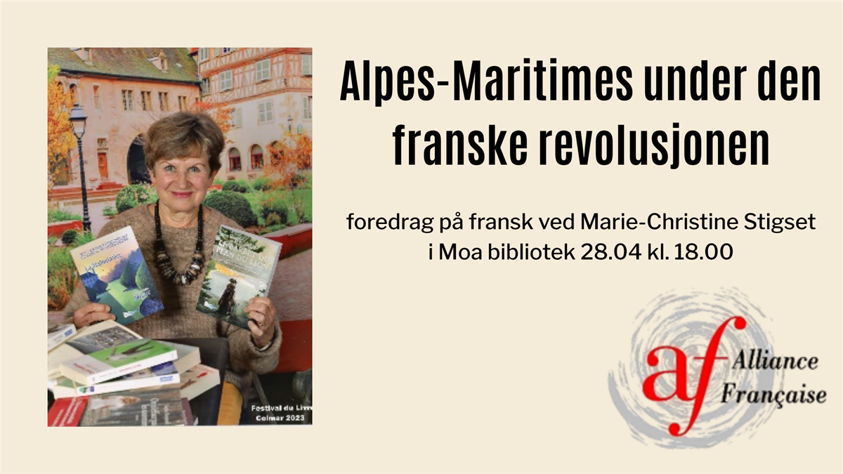 Den franske forfattaren av historiske romanar, Marie-Christine Stigset, held tysdag 28.april kl.18:00 foredrag om dagleglivet i Alpes-Maritimes under den franske revolusjonen på slutten av 1700-talet.